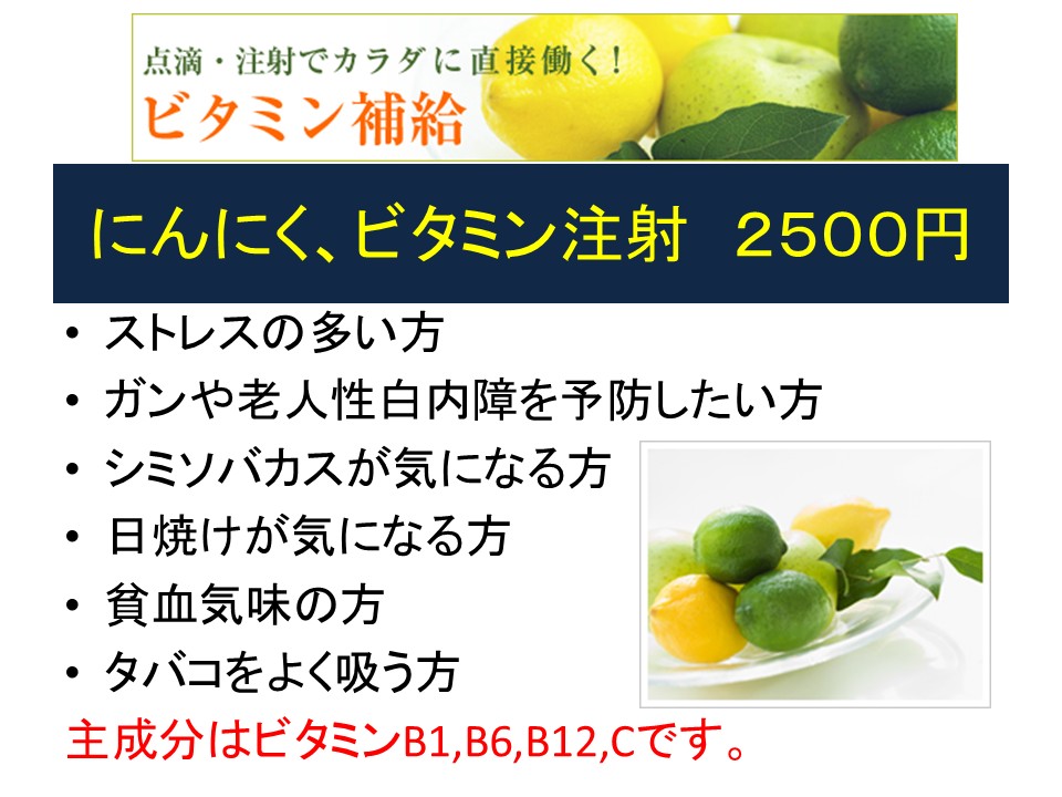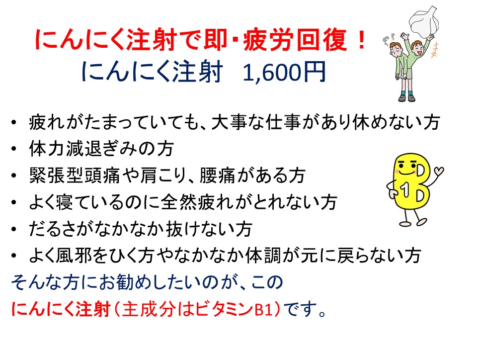 にんにく注射で即・疲労回復! 当院では、にんにく注射、にんにくビタミン注射を行っております。 にんにく注射は自由診療になります。 ・体力減退ぎみの方 ・緊張型頭痛や肩こり、腰痛がある方 ・疲れがたまっていても大事な仕事があり、休めない方 ・よく寝ているのに、全然疲れがとれない方 ・だるさがなかなか抜けない方 ・よく風邪をひく方やなかなか体調が元に戻らない方 そんな方におすすめしたいのが、このにんにく注射(主成分はビタミンB1)です。 ・にんにく注射 1,600円 ・にんにくビタミン注射 2,500円 予約制ではないので、ご都合の良い時にお越しください。(※初回のみ医師の診察が必要となります) 2回目以降は予約不要で窓口でお声がけしていただければすぐにご案内出来ます! 受付終了1時間前までにご来院ください。